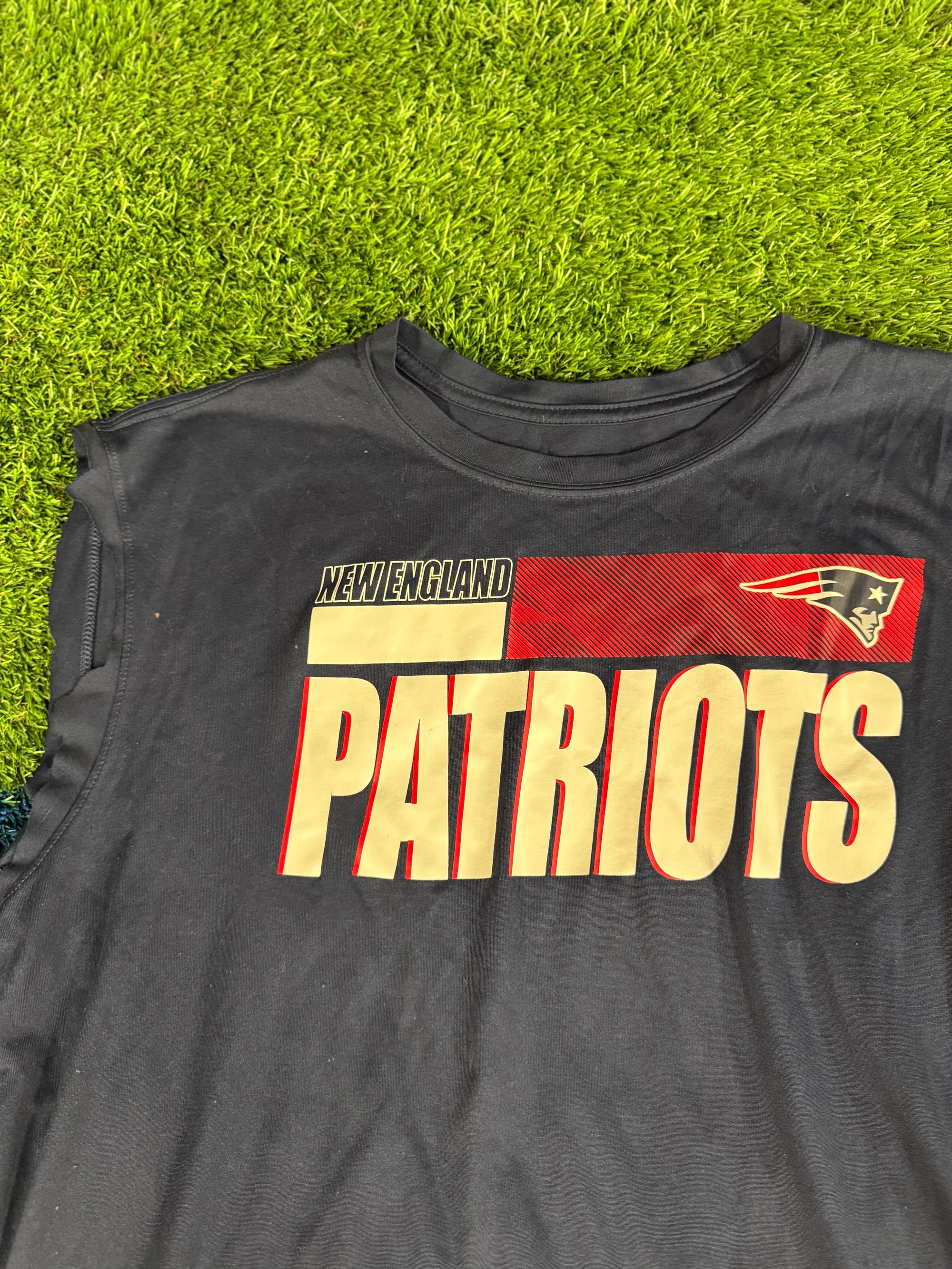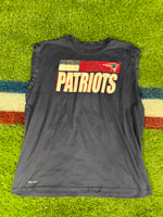 Player worn Nike Dri-Fit team issue NFL Patriots navy Nike tee with cut off sleeves use makes it hard to make out the size it appears to be size large